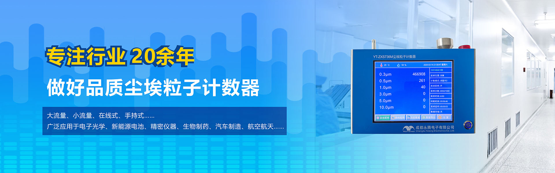 成都永騰電子有限公司位于成都市國家經(jīng)濟技術(shù)開發(fā)區(qū),是一家專業(yè)從事環(huán)境空氣監(jiān)測儀器研發(fā)、生產(chǎn)、銷售于一體的高科技企業(yè)。產(chǎn)品涵蓋空氣檢測儀器、潔凈間在線塵埃粒子計數(shù)器監(jiān)測系統(tǒng)、大氣顆粒物監(jiān)測微站系統(tǒng)、電化學分析儀器、實驗室設備等產(chǎn)品。